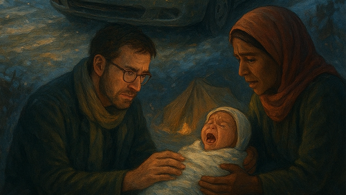 Il reste un campement le long de la route, comme un havre où chercher de l'aide. Noël presse... Cela ou rien... Bien sûr, il ne faut pas s'attendre à grand'chose. On fait ami-ami, il faut bien, on chasse ses nausées. Mais voici que cette migrante est sage-femme de son village et ce grand gaillard médecin dans un hôpital de son pays perdu. L'enfant naît. Il est sain et vigoureux, il braille de joie. Ohé, Noël est accompli ! Mais il faudra que cette histoire du bien se renverse encore... Une surprise attend ces drôles de bouts d'humanité !..."