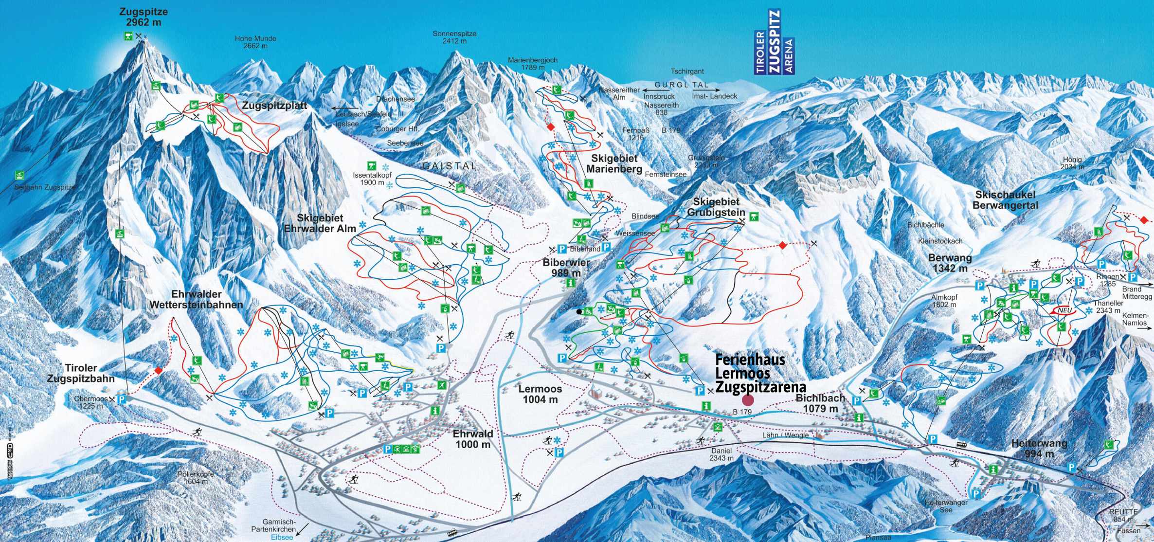 La région "Tiroler Zugspitzarena" (frontalière avec la Bavière) offre des chaînes de montagnes impressionnantes. Avec ses 2962 m, la Zugspitze est le plus haut sommet de la région, même s'il est du côté allemand. Autour de villages charmants comme Lermoos et Ehrwald, on trouve différents domaines de ski alpin avec un total de 147 km de pistes. Les conditions pour skier sont excellentes ! Quant au ski de fond, on y trouve 110 km de pistes qui sillonnent des paysages d’hiver enchanteurs. Mais on peut également profiter de la beauté de l’hiver sans skis ni snowboard au travers de chemins de randonnée balisés ou des randonnées à raquettes. - Le chalet de 45 places offre principalement de confortables chambres à deux, dont certaines disposent de salles d'eau. Par ailleurs, douches et toilettes se trouvent sur le palier.